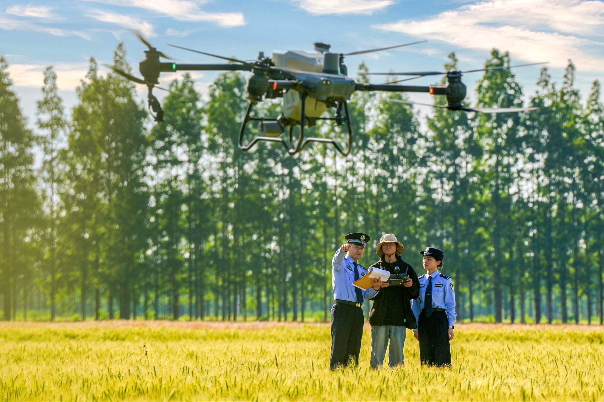 5月16日,上海市公安局崇明分局長江派出所民警來到長江農(nóng)場麥田內(nèi),開展無人機飛手飛行安全指導(dǎo),并引導(dǎo)無人機飛手通過“警民直通車——上?!边M行無人機飛行路徑線申請。