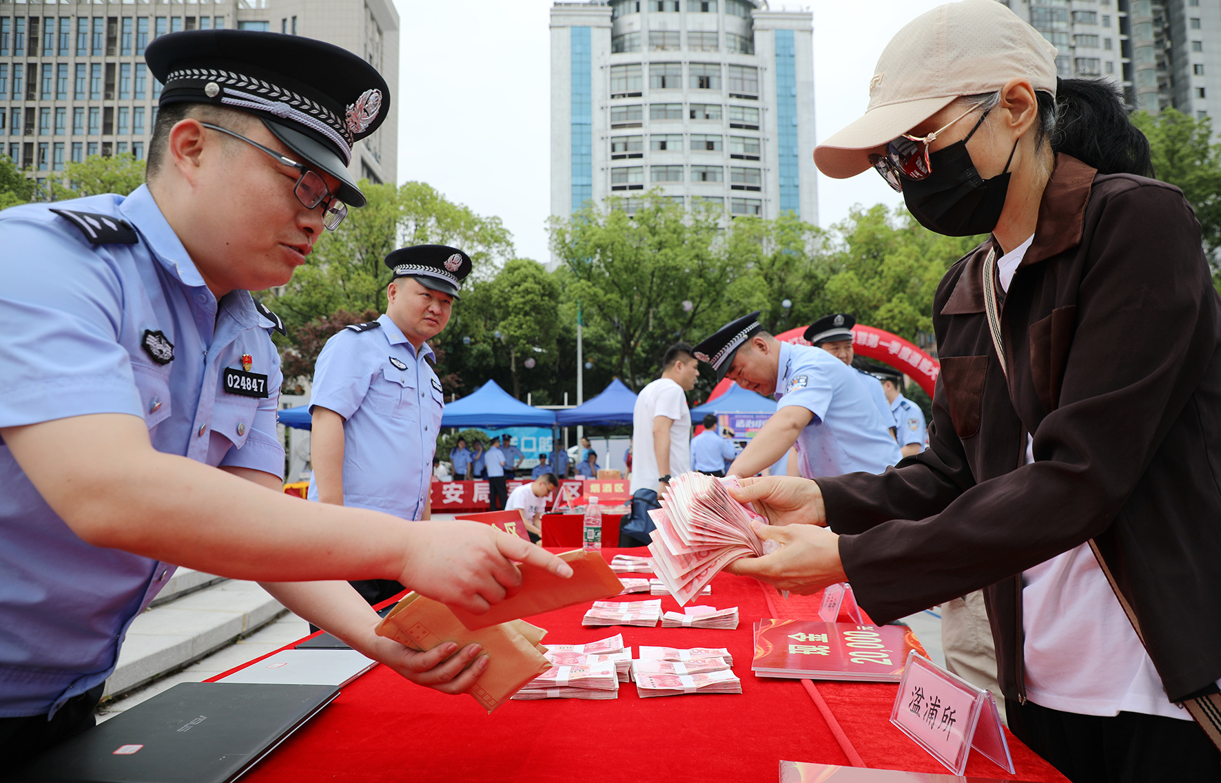 5月20日,江西省九江市公安局潯陽分局舉行涉案財(cái)物集中發(fā)還活動(dòng),將在近期繳獲的涉案財(cái)物發(fā)還給群眾。