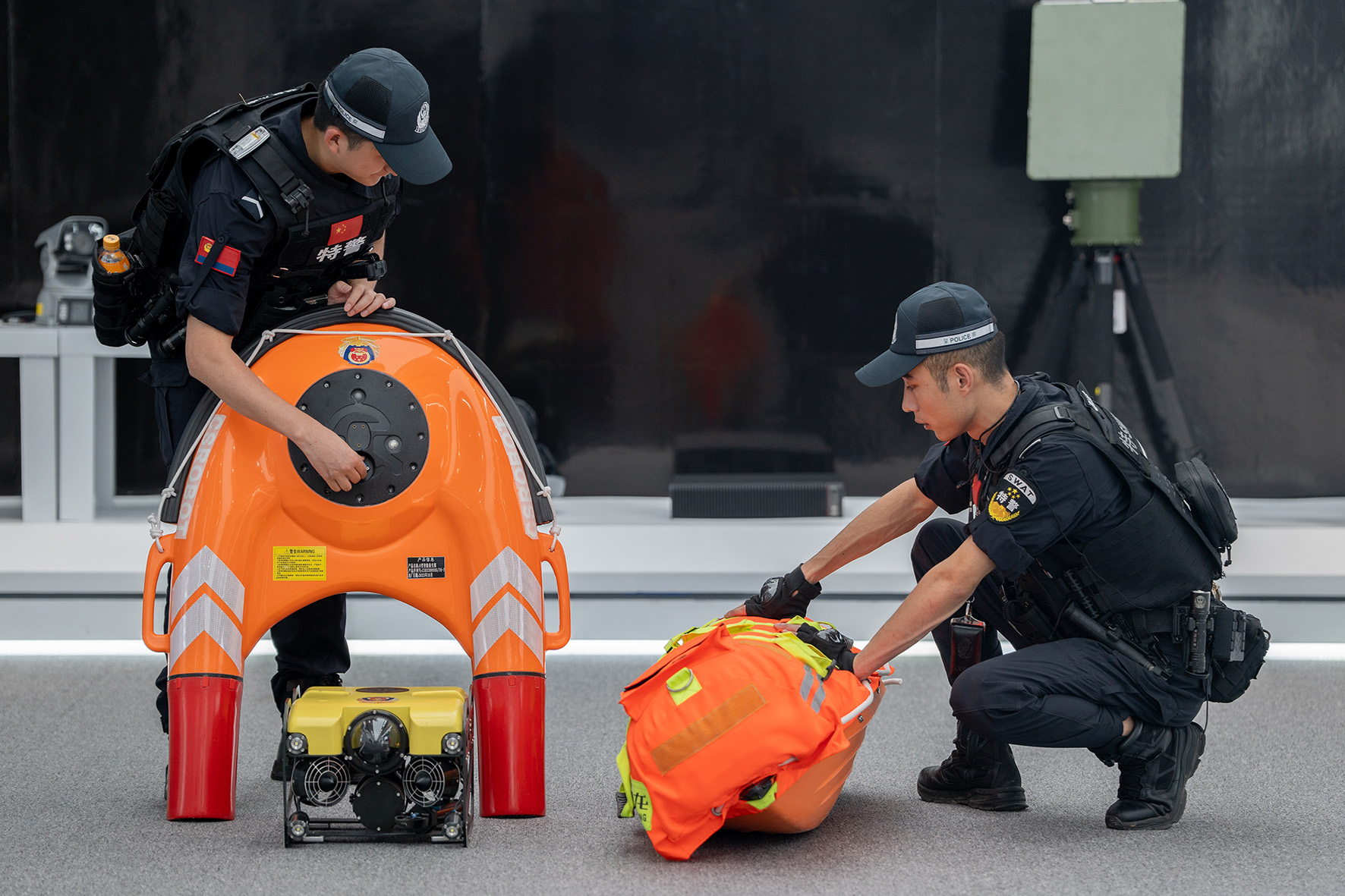 圖三:綿陽市公安局科新區(qū)分局民警練習操作水面救援機器人。