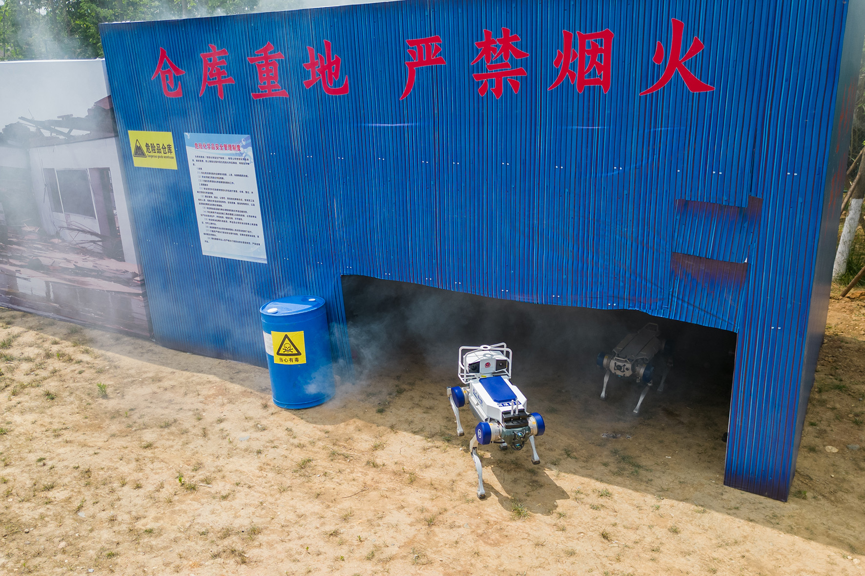 圖二:綿陽市公安局刑偵支隊民警在綿陽科技城新區(qū)機器人研學基地開展現(xiàn)堪機器狗的測試和應用。