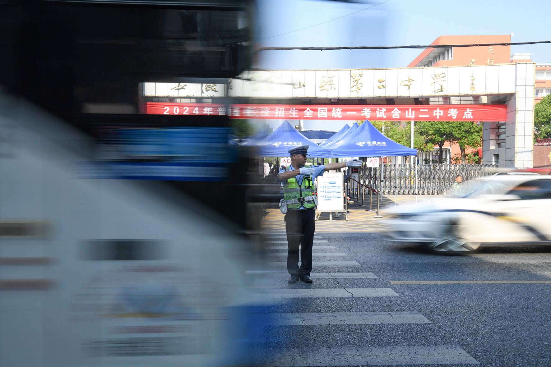 6月9日,安徽省合肥市公安局交警支隊民警在合肥考區(qū)八中考點外維護秩序。