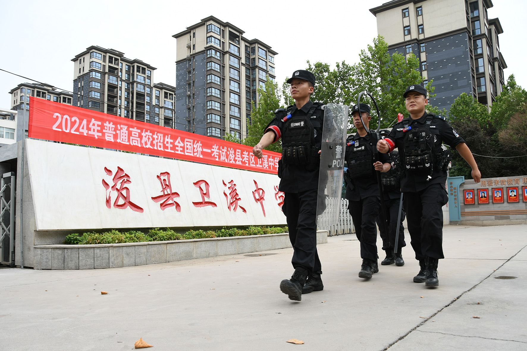 6月7日,河南省浚縣公安局民警輔警在高考考點巡邏執(zhí)勤。