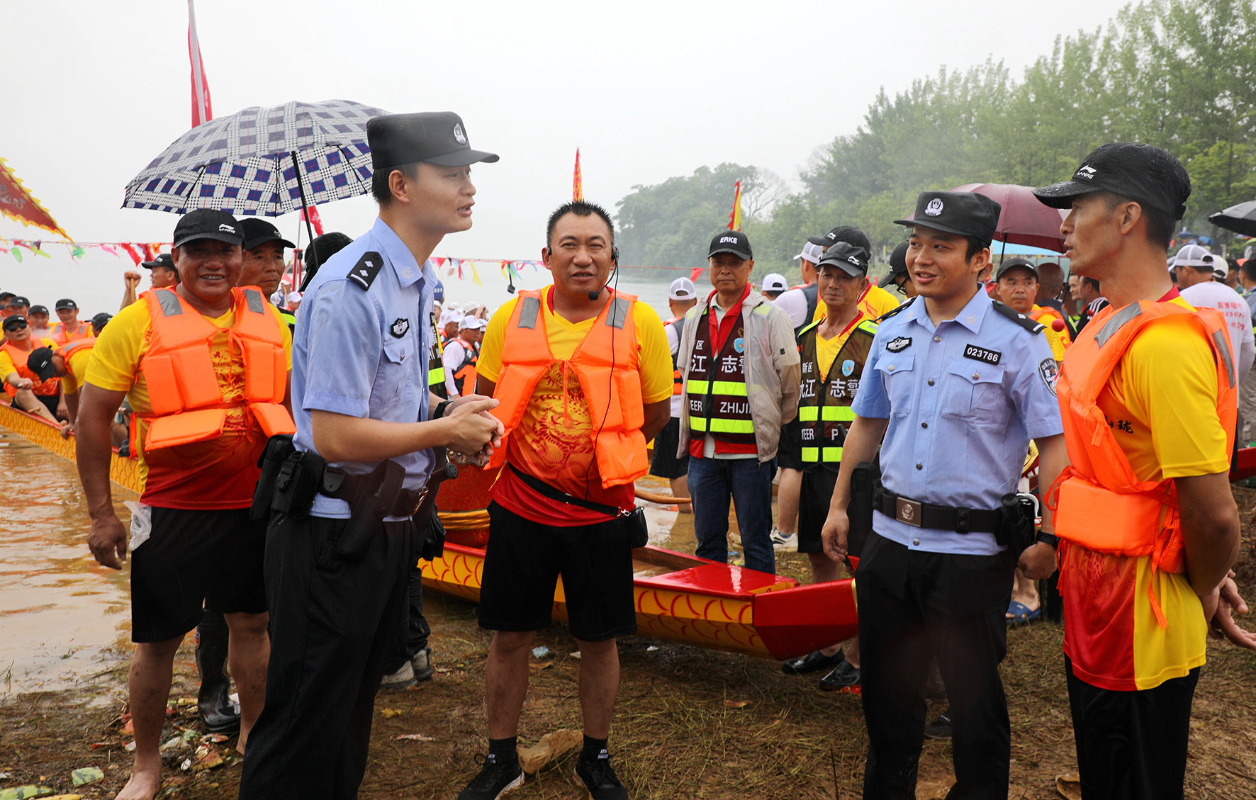 6月9日,江蘇省鹽城市公安局亭湖分局巡特警在2024年中華龍舟大賽現(xiàn)場執(zhí)勤。