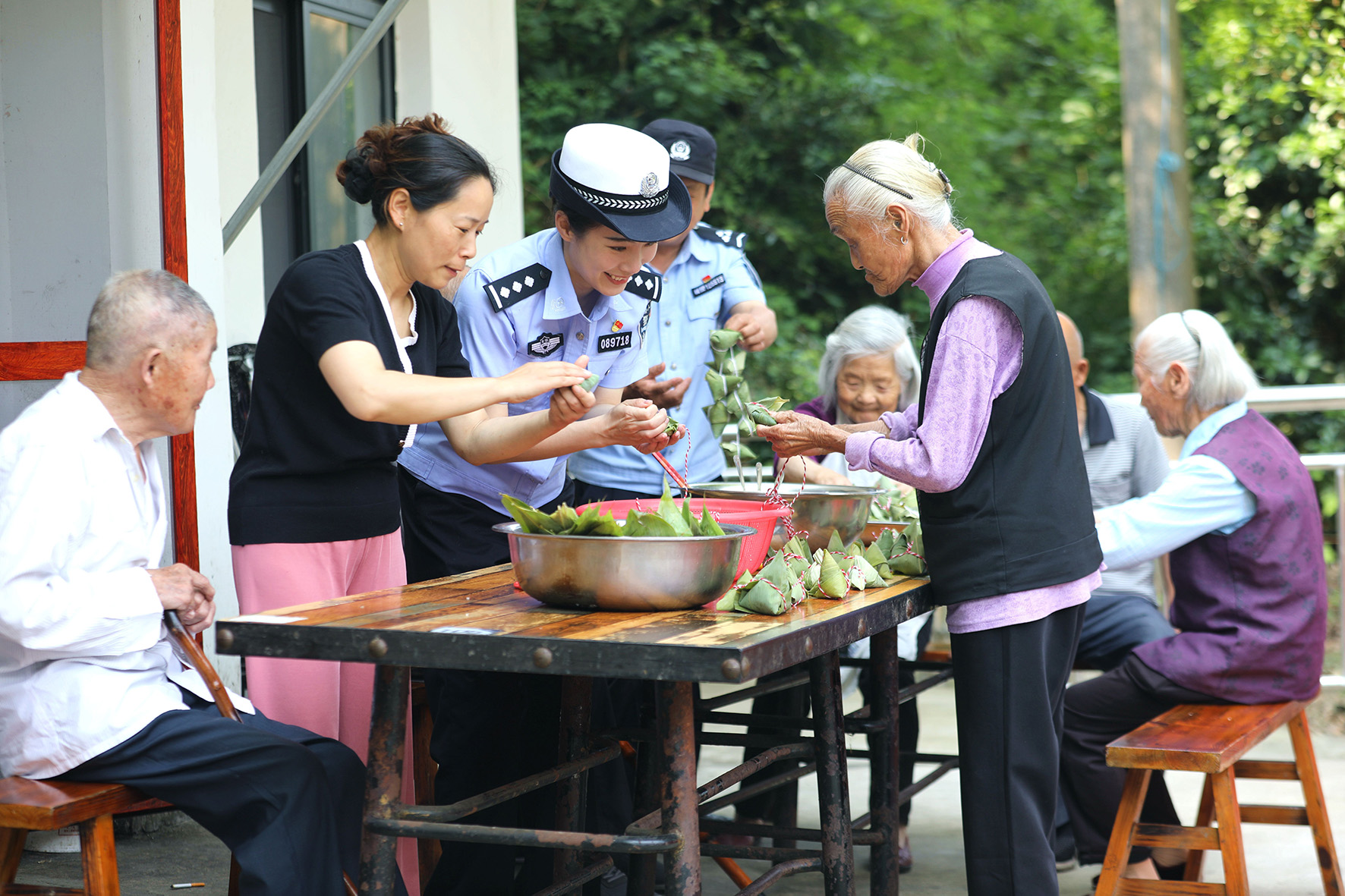 6月9日,安徽省舒城縣公安局交管大隊聯(lián)合五顯派出所走進轄區(qū)敬老院,與老人們一起包粽子,宣講出行、用電等方面安全知識。