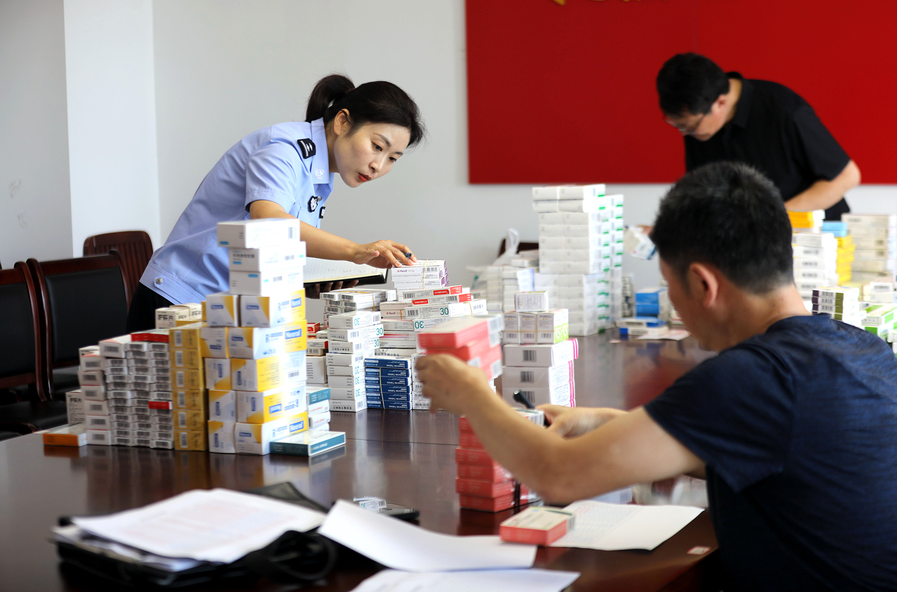 圖為7月3日,民警配合縣價(jià)格認(rèn)證中心工作人員清點(diǎn)查扣藥品。