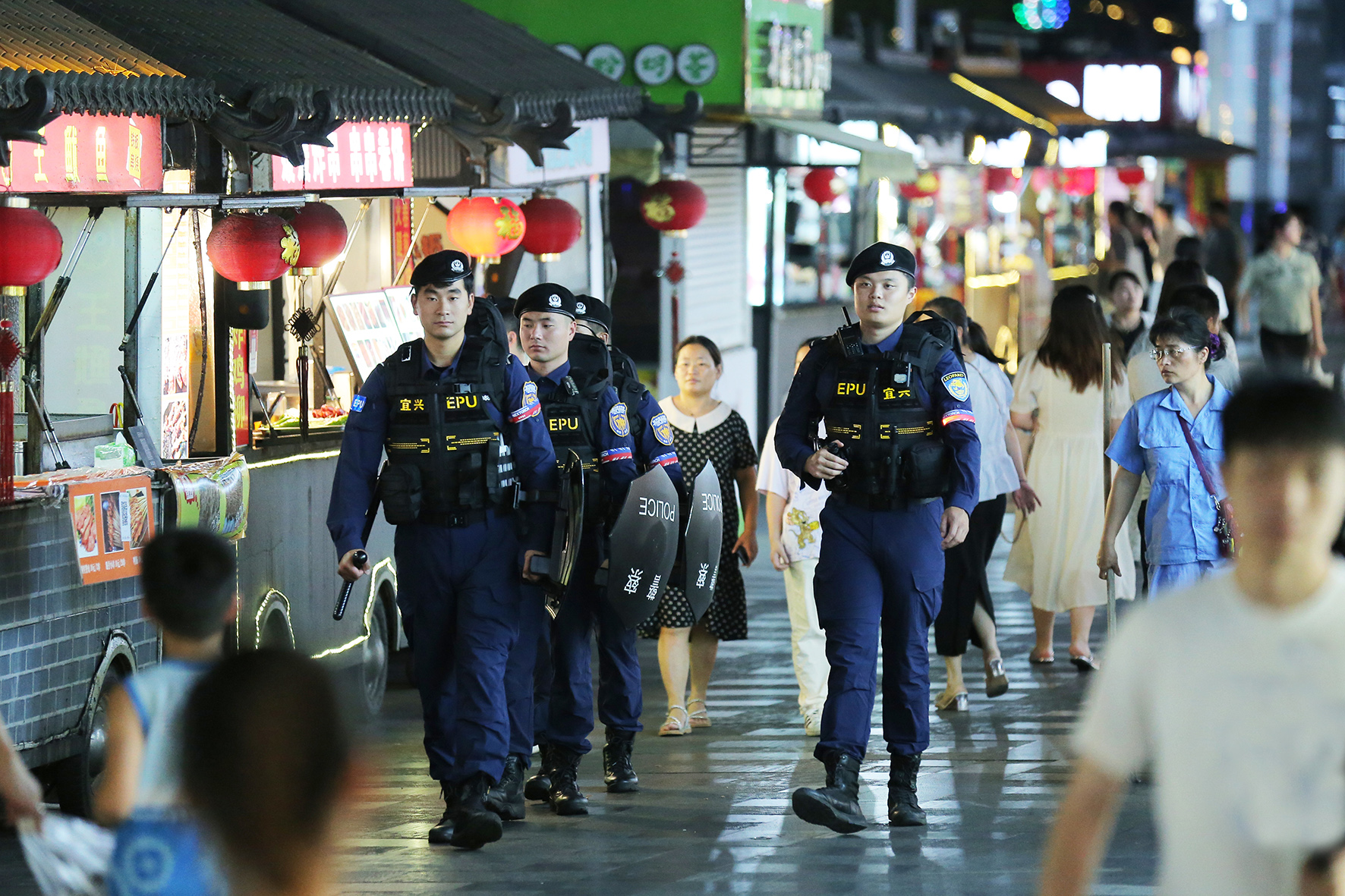 7月7日,江蘇省宜興市公安局巡特警EPU精英小隊(duì)囤警街面夜市,亮燈見警,守護(hù)夏夜平安煙火氣。