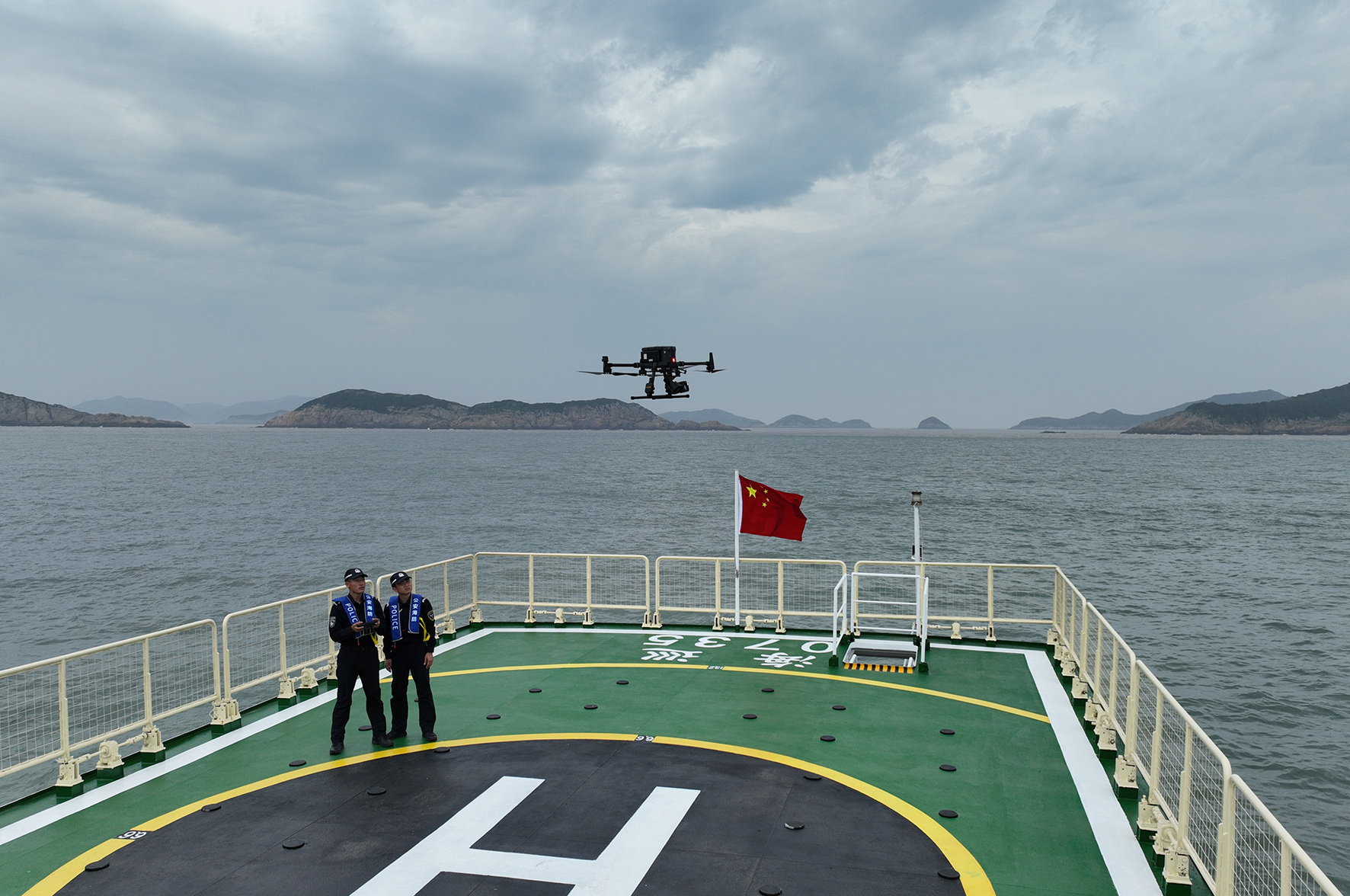 圖為岱山縣公安局魚鷹戰(zhàn)隊利用無人機對無人島進行巡查。
