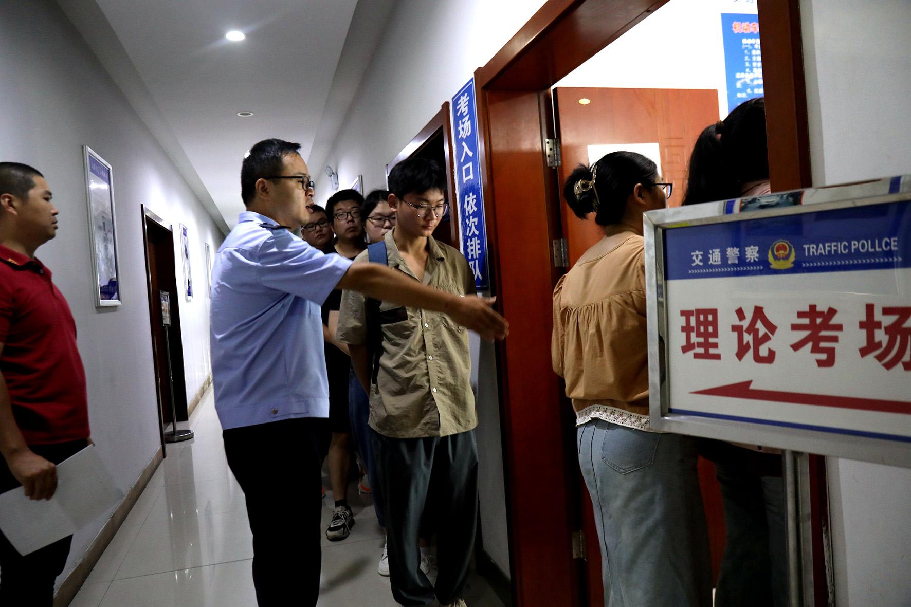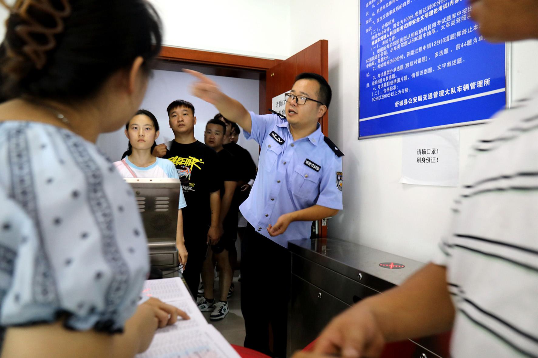 8月1日,安徽省舒城縣公安局交管大隊車管所民警輔警在科目一考場為參加考試的考生提供服務。暑假期間,報名駕考人員大部分為大學生及高中畢業(yè)生,車管所通過增加工作時間、考試場次、增派考試員等方式,全力應對暑期“駕考熱”。
