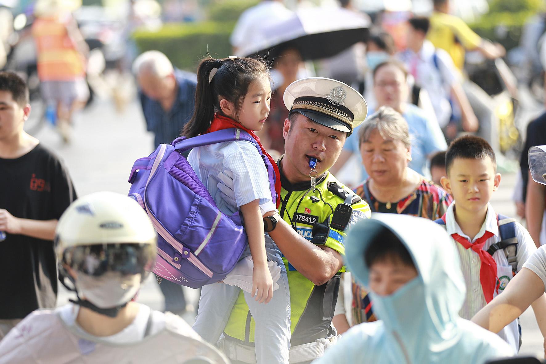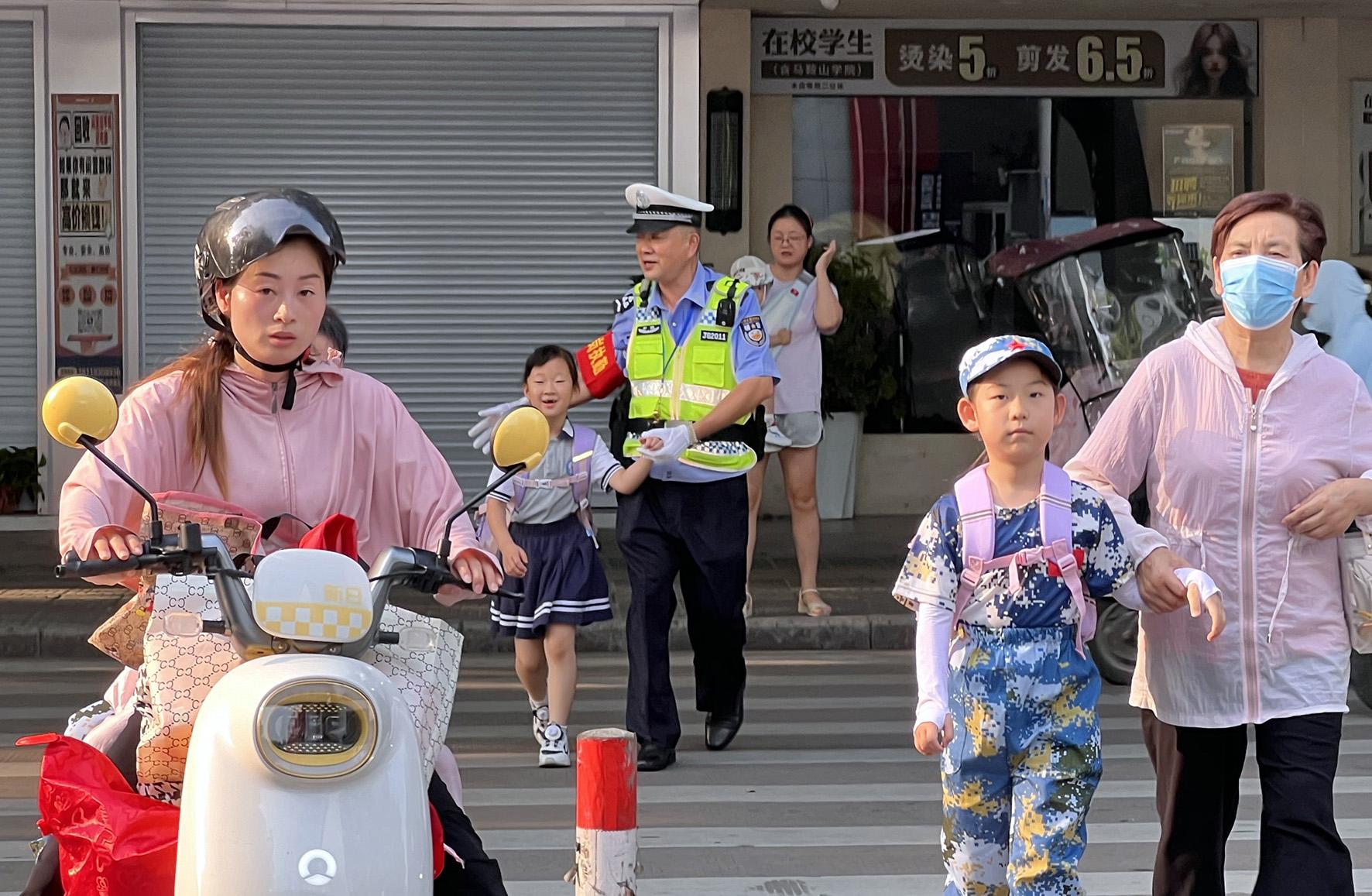 9月2日,安徽省當涂縣公安局交管大隊民警正在校園周邊維護交通秩序,護送孩子們平安進校園。