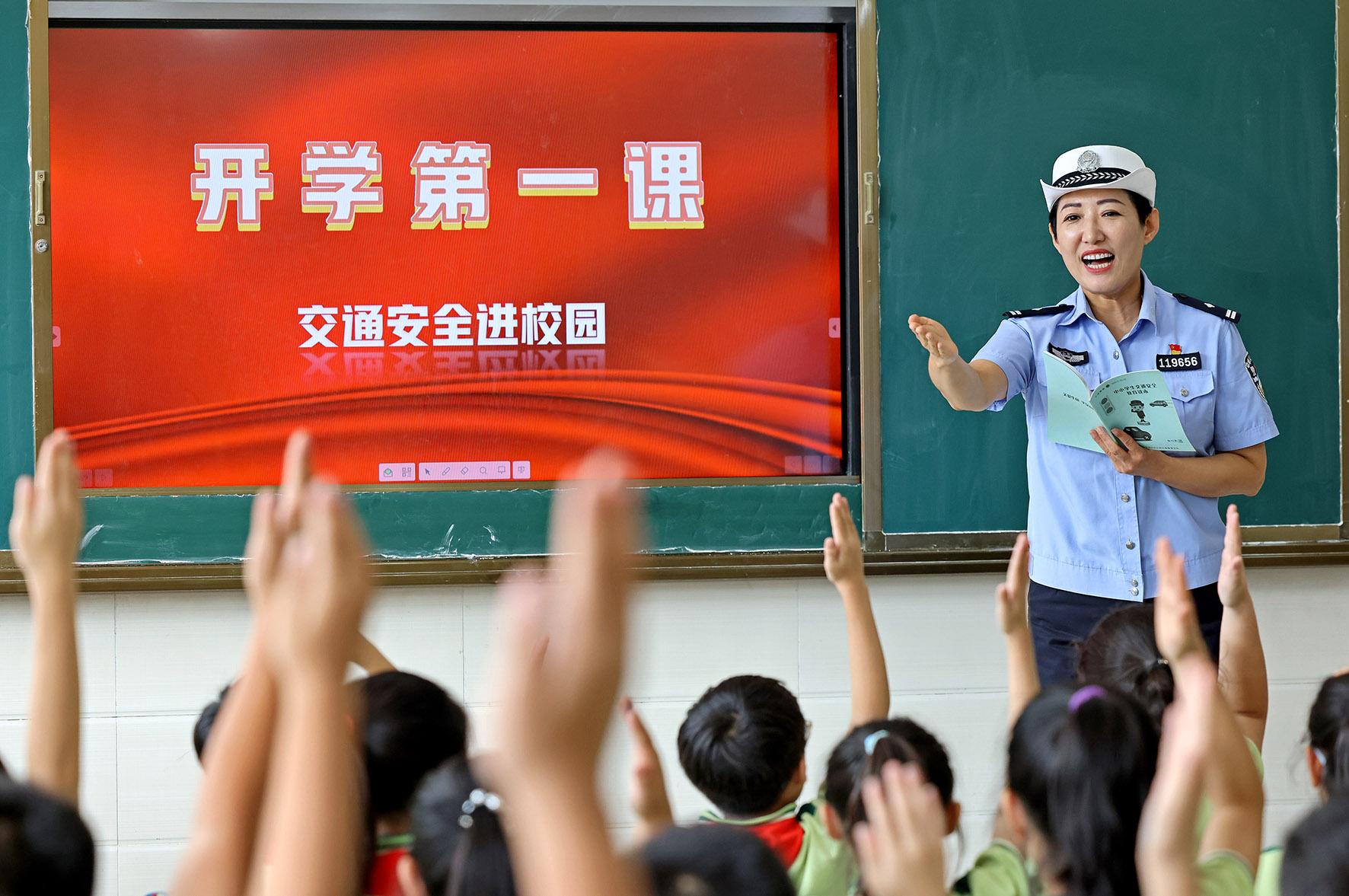 9月2日,安徽省阜南縣公安局交管大隊民輔警走進轄區(qū)中小學校,開展“知危險、避危險”交通安全開學第一課活動。