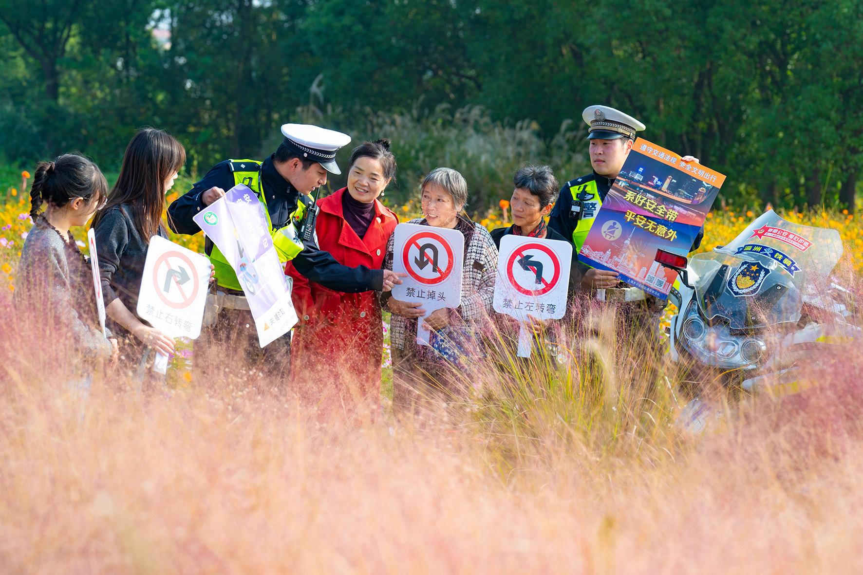 11月13日,上海市公安局崇明分局交警支隊民警來到新城公園,向賞花打卡的游客開展了一場交通安全宣傳活動。