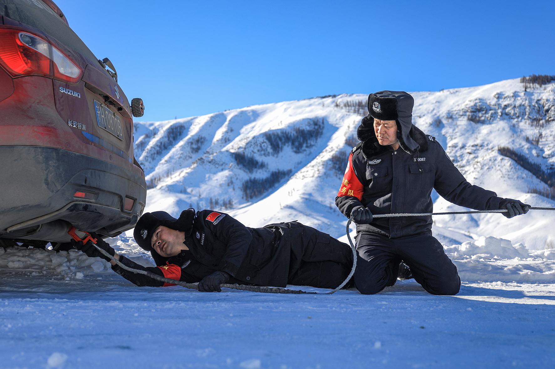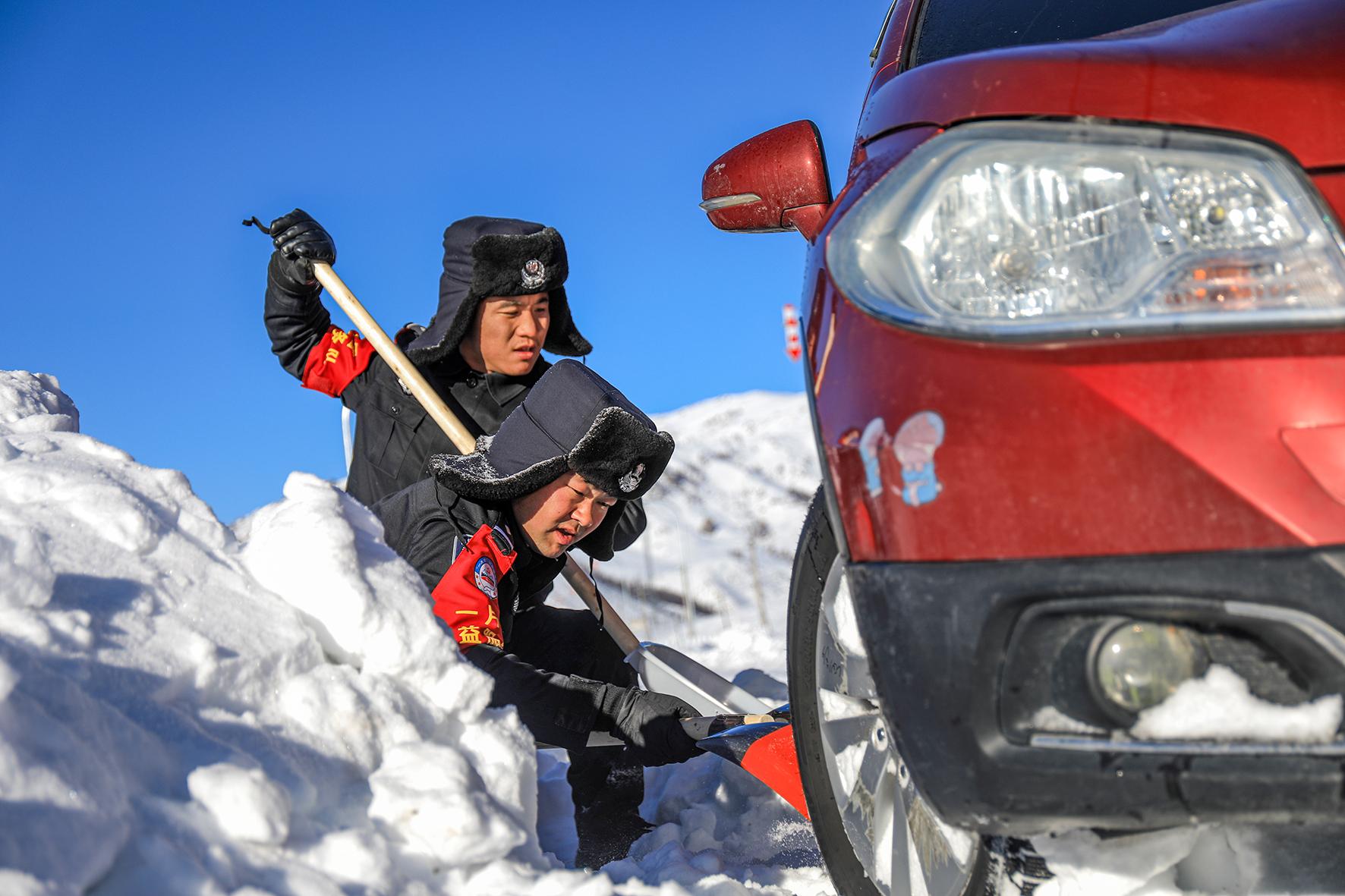12月5日12時(shí)許,新疆出入境邊防檢查總站阿勒泰邊境管理支隊(duì)庫(kù)衛(wèi)邊境派出所接到群眾求助稱車輛因積雪滑下路基被困。接到求助警情后,巡邏警力第一時(shí)間趕赴現(xiàn)場(chǎng),通過(guò)清挖積雪和警車牽引的方式,成功將被困人員和車輛救出。