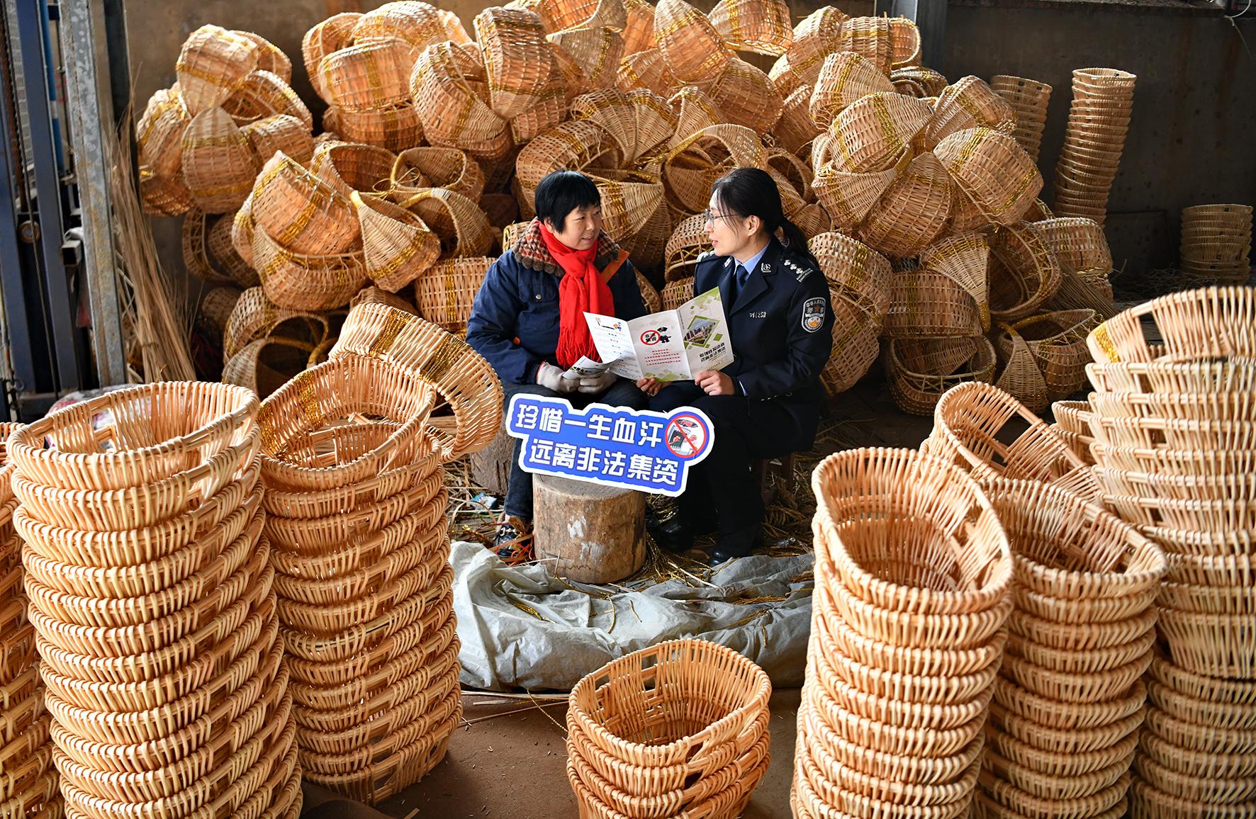 12月11日,安徽省阜南縣公安局郜臺(tái)派出所民警在轄區(qū)一柳編企業(yè)向工人宣講防騙知識(shí)。阜南縣公安局經(jīng)偵大隊(duì)聯(lián)合郜臺(tái)派出所開展“冬季送平安 送法進(jìn)企業(yè)”冬季行動(dòng)宣傳。
