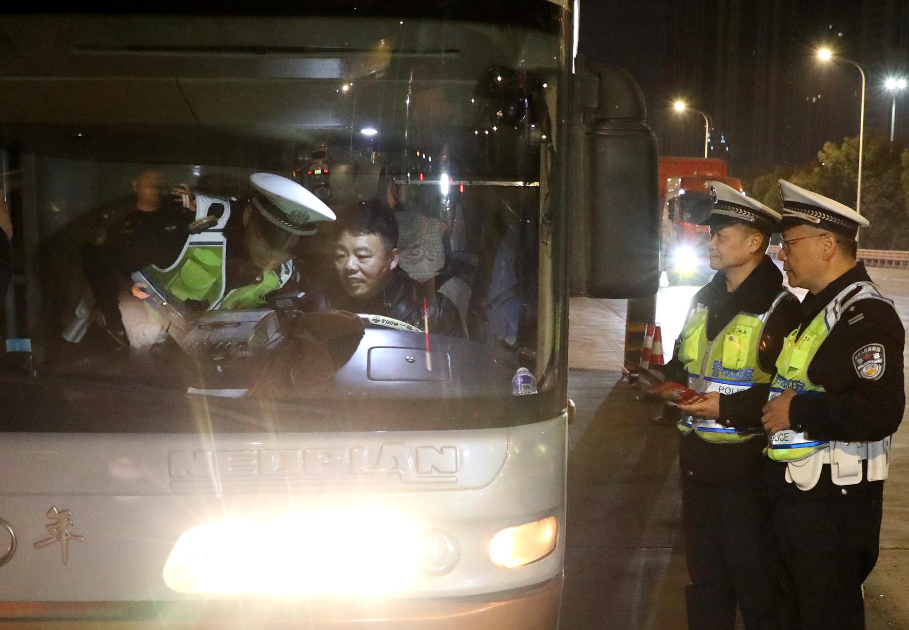 1月14日,江西省九江市公安局交管支隊第一大隊執(zhí)勤民警輔警在九江長江一橋?qū)蛙囘M行安全檢查。