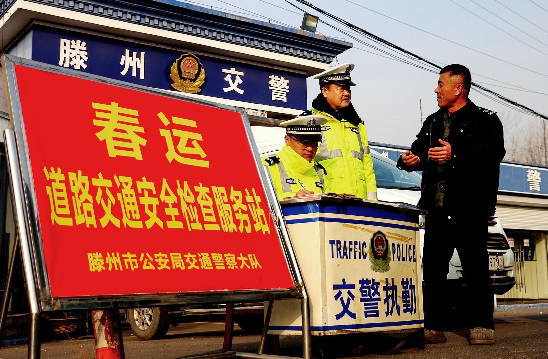 1月14日,山東省滕州市公安局交警大隊在京臺高速滕州北出口設(shè)置“春運檢查點”,開展車輛安全檢查和交通安全宣傳。