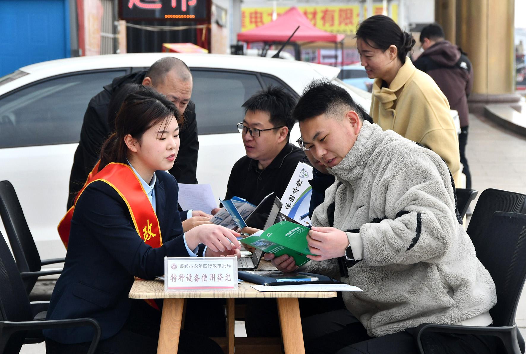 3月14日,河北省邯鄲市永年區(qū)行政審批局把政務(wù)服務(wù)“辦公桌”搬到企業(yè)群眾“家門口”,組織工作人員深入緊固件產(chǎn)業(yè)聚集區(qū),現(xiàn)場為企業(yè)和群眾集中辦理特種設(shè)備使用登記業(yè)務(wù)。