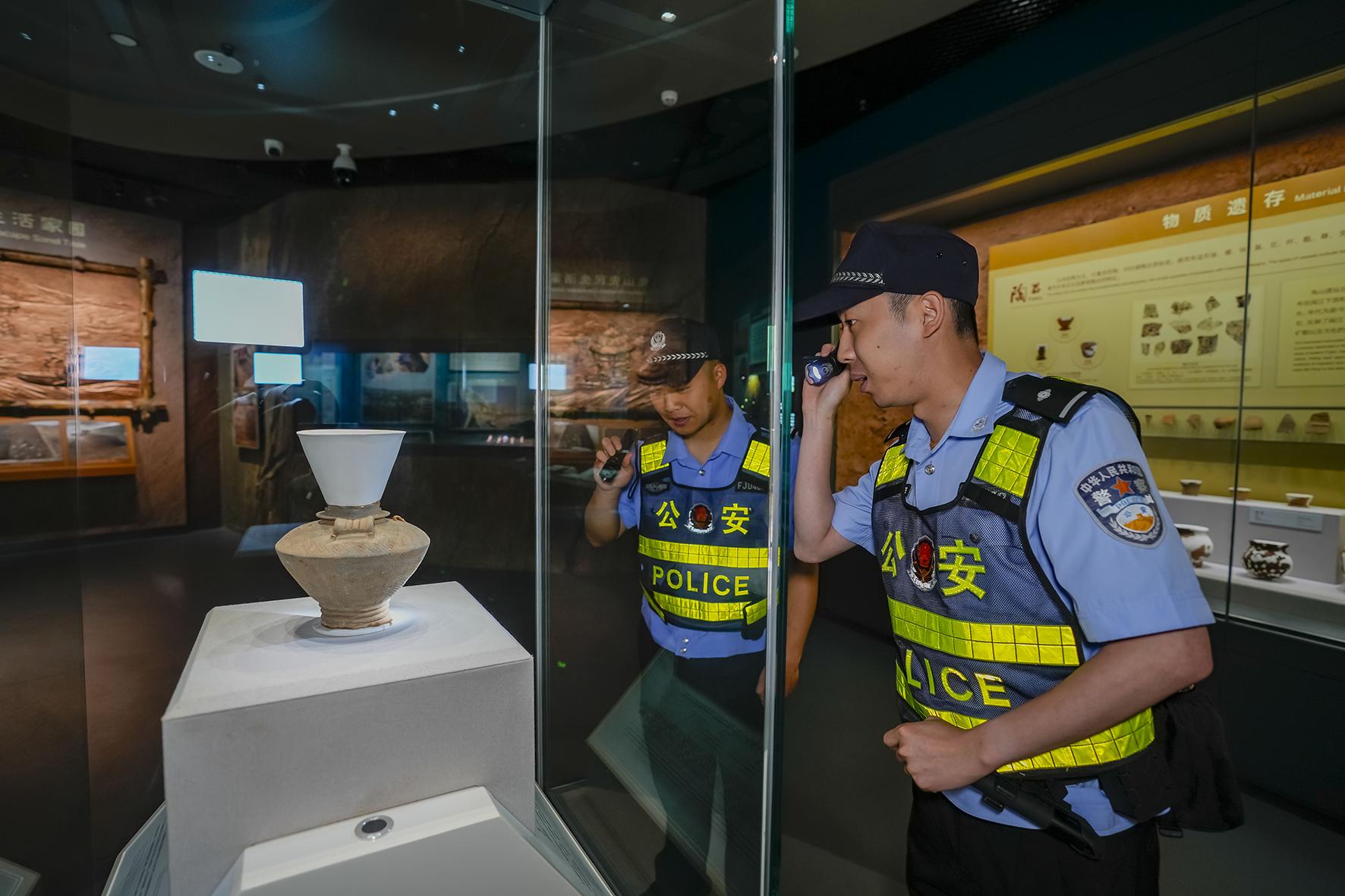 圖為5月29日,民警在殼丘頭遺址博物館開(kāi)展安全檢查。