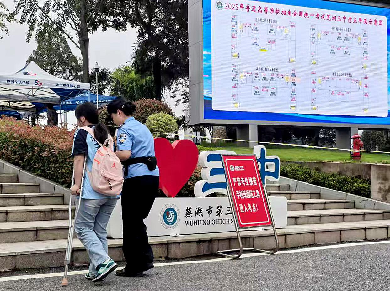 6月9日,安徽省蕪湖市公安局鏡湖分局赭麓派出所所長(zhǎng)劉莉連續(xù)三天為一名行動(dòng)不便的考生提供幫助。