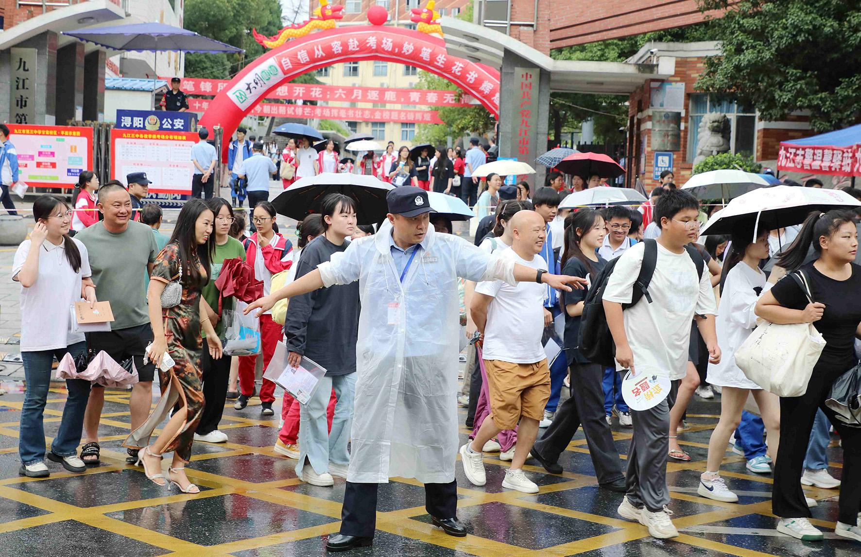 6月8日,江西省九江市公安局潯陽分局民輔警冒雨在九江市三中考點(diǎn)指揮疏導(dǎo)交通。