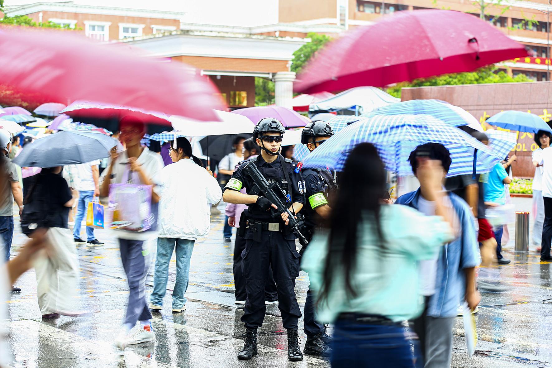 6月7日,江蘇省南通市在雨中迎來高考。南通市公安局民警全警動(dòng)員,堅(jiān)守崗位,護(hù)航學(xué)子圓夢(mèng)。