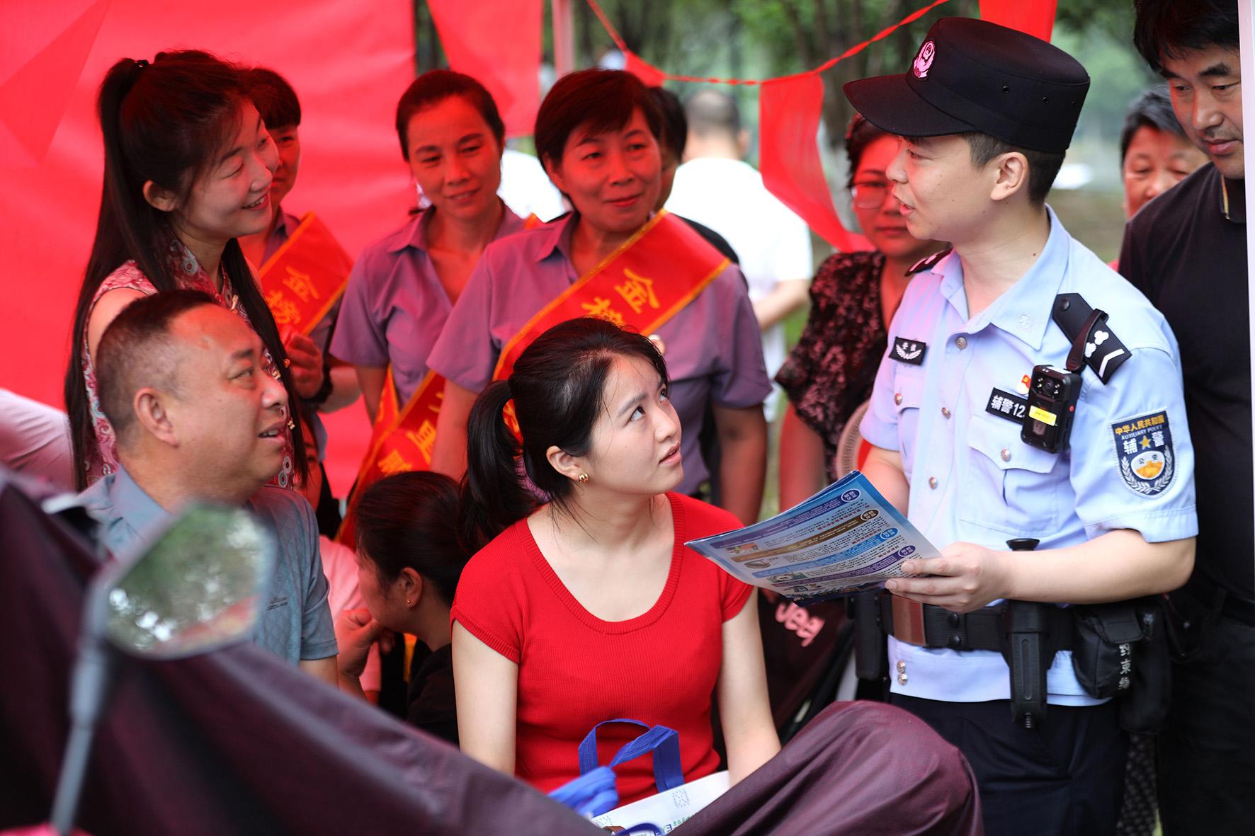 6月9日,安徽省宿松縣公安局交警大隊(duì)護(hù)考民輔警向家長(zhǎng)宣傳防交通事故 、防溺水、防網(wǎng)絡(luò)詐騙知識(shí)。