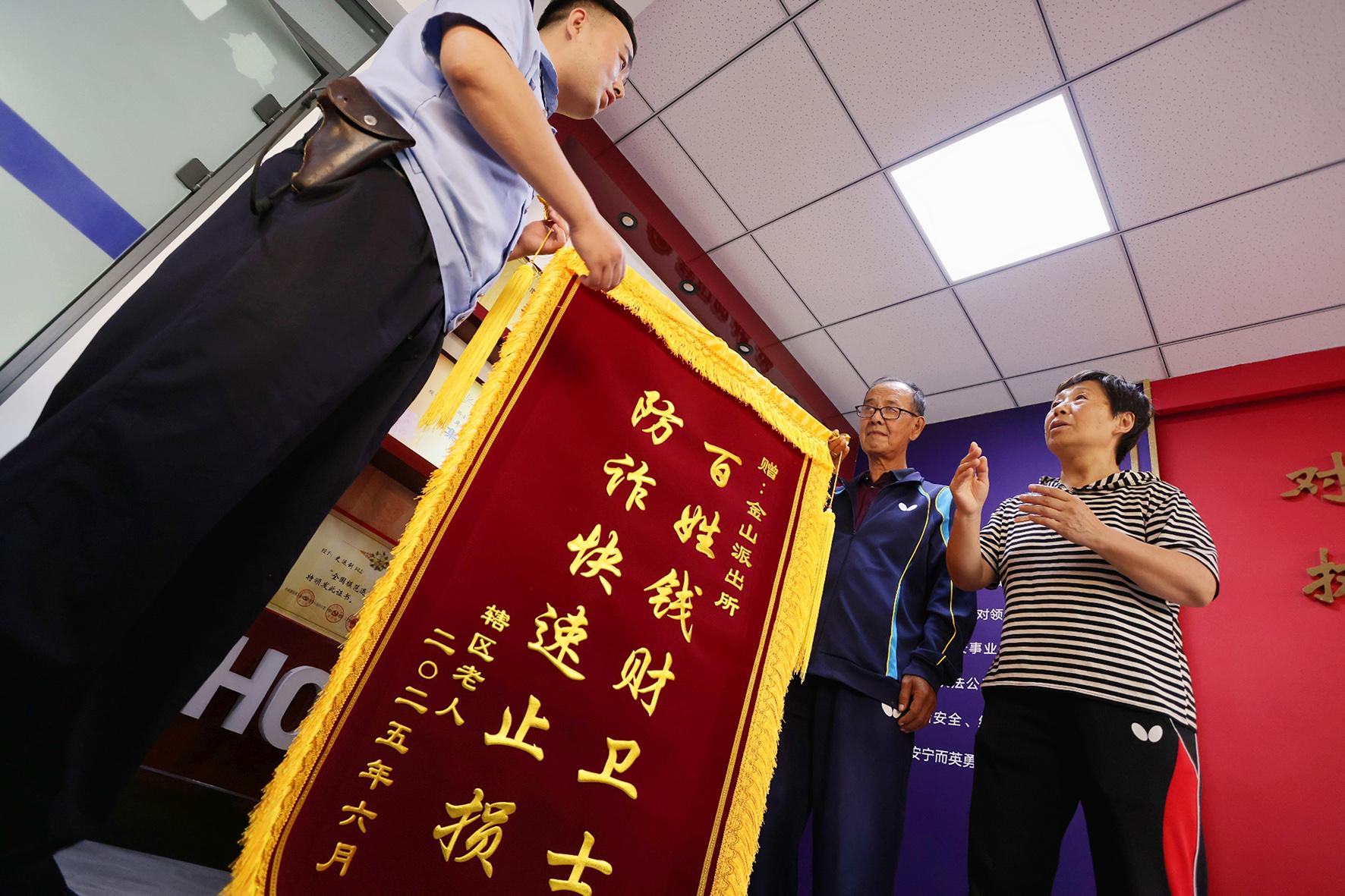 6月16日,一對(duì)老年夫妻來到遼寧省本溪市公安局明山分局金山派出所,將精心制作的錦旗送到民警手中,感謝民警及時(shí)幫助老人識(shí)破騙局,保住了養(yǎng)老救命錢。