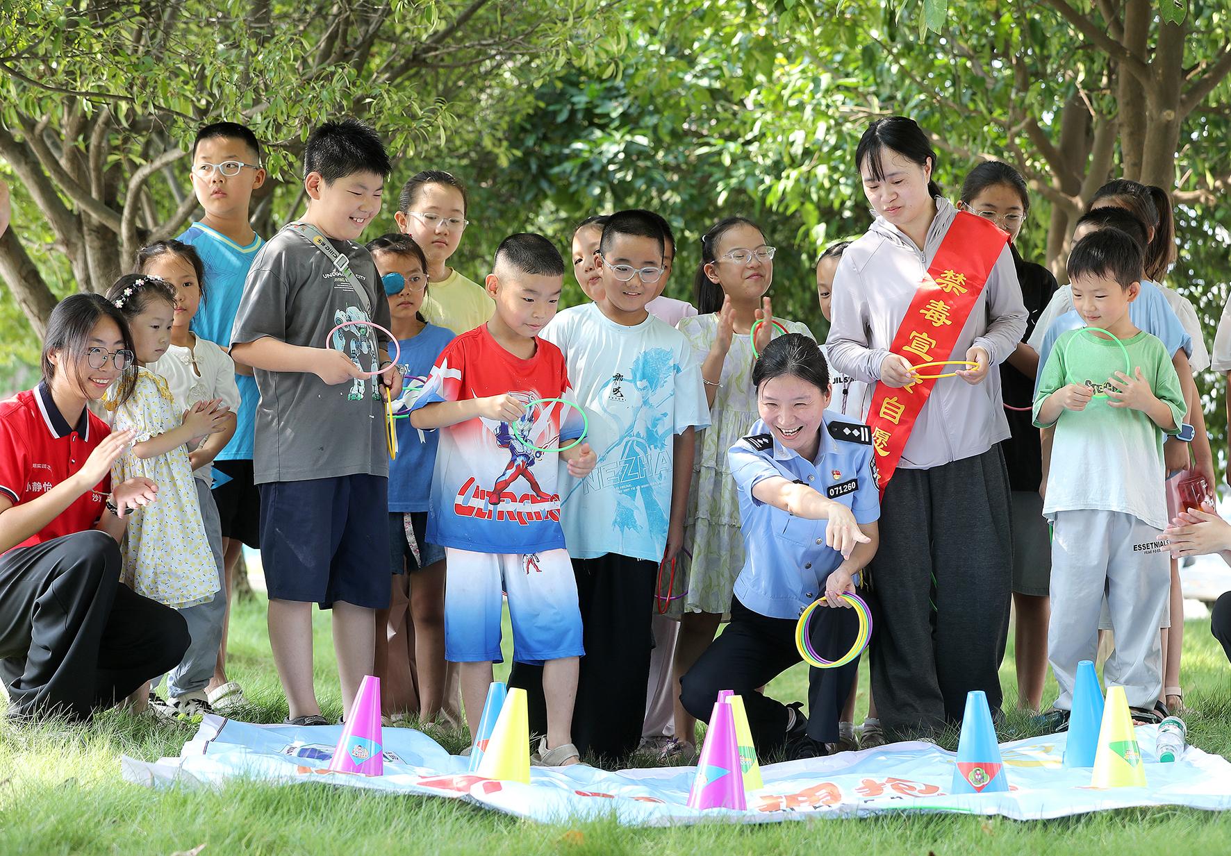 7月28日,湖北省荊門市沙洋縣公安局民警走進(jìn)洪嶺社區(qū)“愛(ài)心托管班”,以趣味互動(dòng)游戲?yàn)檩d體,向青少年開(kāi)展防溺水、預(yù)防校園欺凌及禁毒知識(shí)宣傳,讓孩子們?cè)跉g樂(lè)中提升自我保護(hù)能力。