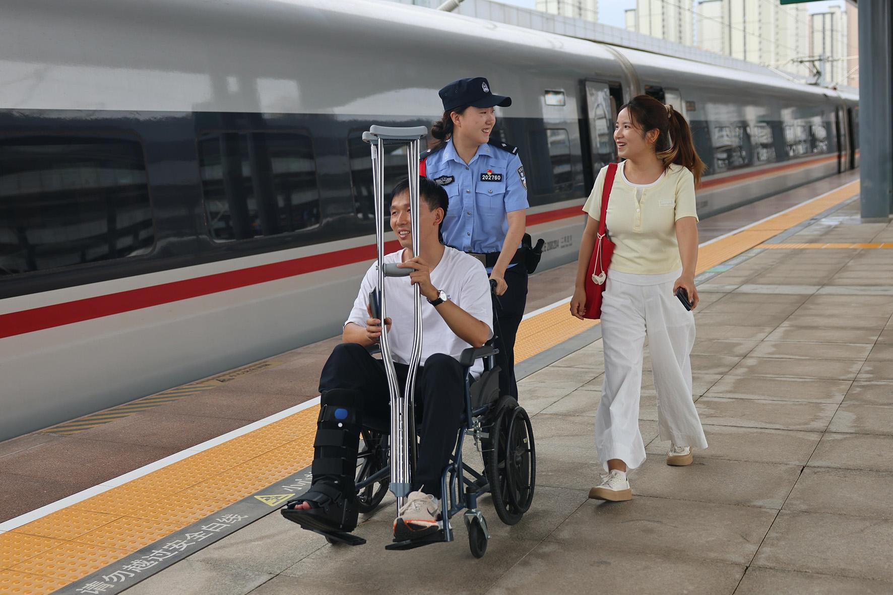 圖為8月5日,民警在站臺幫助行動(dòng)不便旅客乘車。