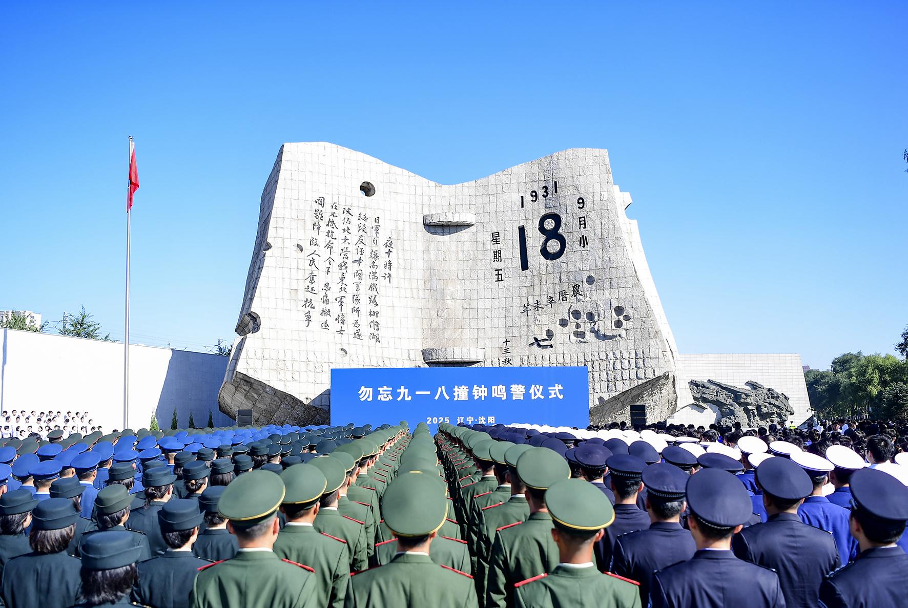 9月18日,“勿忘九一八”撞鐘鳴警儀式在遼寧省沈陽“九·一八”歷史博物館殘歷碑廣場舉行。沈陽市公安局民輔警通過參加儀式等方式緬懷英烈。