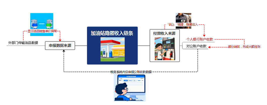 通過(guò)數(shù)據(jù)分析,該局檢查人員理清了該加油站“個(gè)人銀行賬號(hào)收款——部分收款轉(zhuǎn)入對(duì)公賬戶——通過(guò)對(duì)公賬戶購(gòu)油”的資金運(yùn)轉(zhuǎn)鏈條,并結(jié)合該加油站經(jīng)營(yíng)模式的特點(diǎn),對(duì)油品的出入庫(kù)情況與資金流向進(jìn)行匹配分析,最終還原了該加油站的實(shí)際經(jīng)營(yíng)狀況,查清了其隱匿銷售收入的違法事實(shí)。經(jīng)查實(shí),該加油站共隱匿銷售收入908.49萬(wàn)元,造成少繳增值稅、企業(yè)所得稅等各項(xiàng)稅費(fèi)款合計(jì)126.93萬(wàn)元。