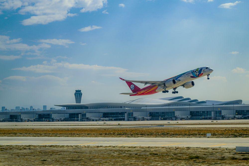 9月15日,一架飛機從烏魯木齊天山國際機場起飛。新華社記者 陳朔 攝