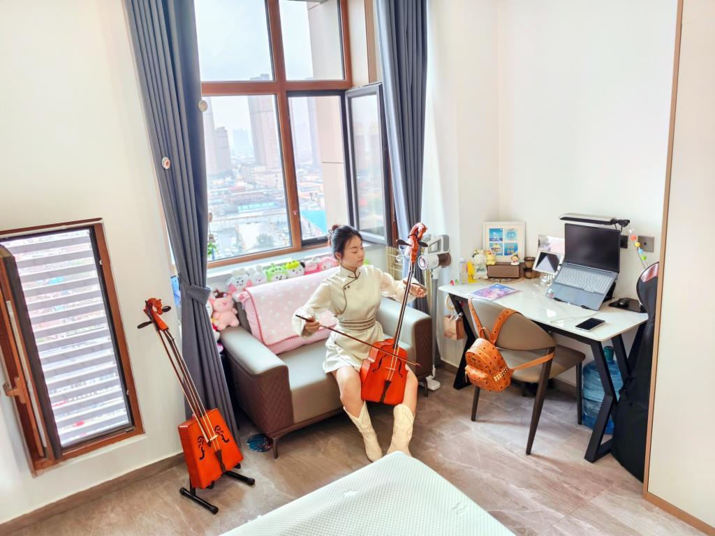 王禹驕在租住的青年公寓內(nèi)練習馬頭琴。(受訪者供圖)