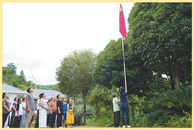 拿著鋤頭出工的鄉(xiāng)親,晨起的學(xué)生,專程過來的男女老少……30多名村民圍在旗桿邊,自覺立正、唱國歌、行注目禮,用堅(jiān)定的眼神注視著飄揚(yáng)的紅旗。山風(fēng)與鳥鳴,為齊唱的國歌聲伴奏。