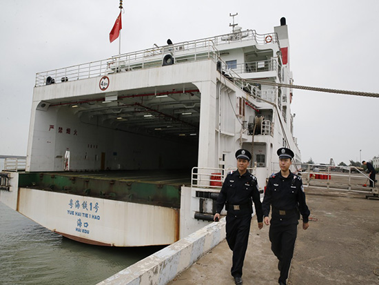 火車輪渡南港派出所副所長(zhǎng)張曉攜民警戈丹巡邏輪渡碼頭。張新新 攝