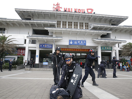 當(dāng)天上午10時(shí),??谲囌菊厩皬V場(chǎng),忽然沖入1名“暴徒”手持砍刀“追砍”群眾。