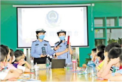 安徽省蕪湖市公安局交警支隊(duì)民警近日走進(jìn)南陵縣畢家橋書房,向在場的30余名小學(xué)生宣講道路交通、防溺水等安全知識。圖為民警向小學(xué)生展示酒精測試儀等警用裝備,講解其作用和意義。