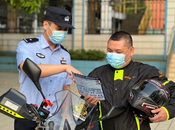 10月28日,廣西壯族自治區(qū)柳州市公安局柳南分局河西派出所民警在執(zhí)勤過程中對摩托車騎手進行法律宣傳。 張仲劍 攝