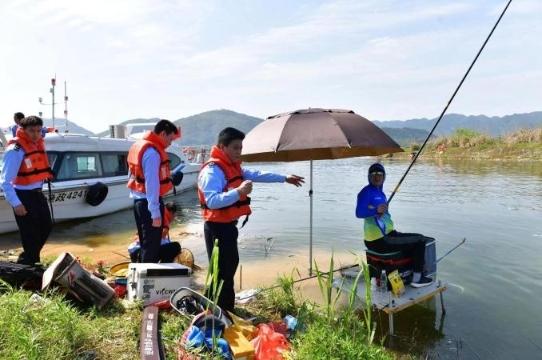 圖為2022年4月9日,湖北省咸寧市農(nóng)業(yè)綜合執(zhí)法支隊(duì)執(zhí)法人員在通山縣富水湖水域檢查垂釣釣具是否合規(guī),宣傳禁漁禁捕政策。 夏正鋒 攝