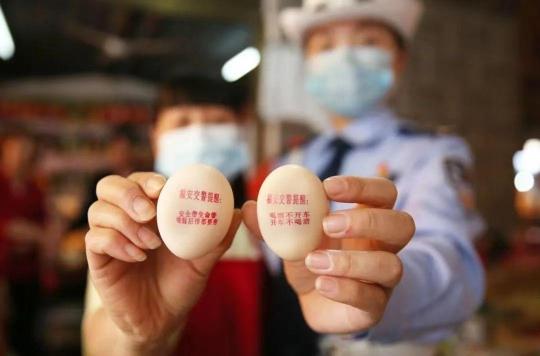 3月15日,福建省福安市公安局交警大隊(duì)女子護(hù)學(xué)崗中隊(duì)組織警力深入超市開(kāi)展“一盔一帶”主題宣傳活動(dòng),把交通安全宣傳標(biāo)語(yǔ)“印刷”在雞蛋上。 林杰 攝