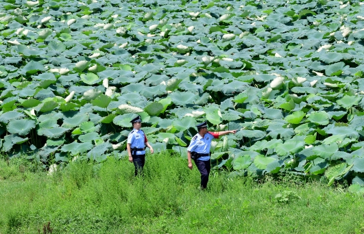 安徽省阜南縣曹集鎮(zhèn)位于淮河岸邊,當(dāng)?shù)卮迕窭脻竦厮练N植藕蓮發(fā)展特色經(jīng)濟(jì),阜南縣公安局安崗派出所組織警力加強(qiáng)萬畝藕蓮基地白天夜晚的巡查力度,護(hù)航鄉(xiāng)村振興經(jīng)濟(jì)發(fā)展。圖為8月2日民警在曹集鎮(zhèn)萬畝藕蓮基地開展巡查工作。法治日報全媒體通訊員 呂乃明 攝