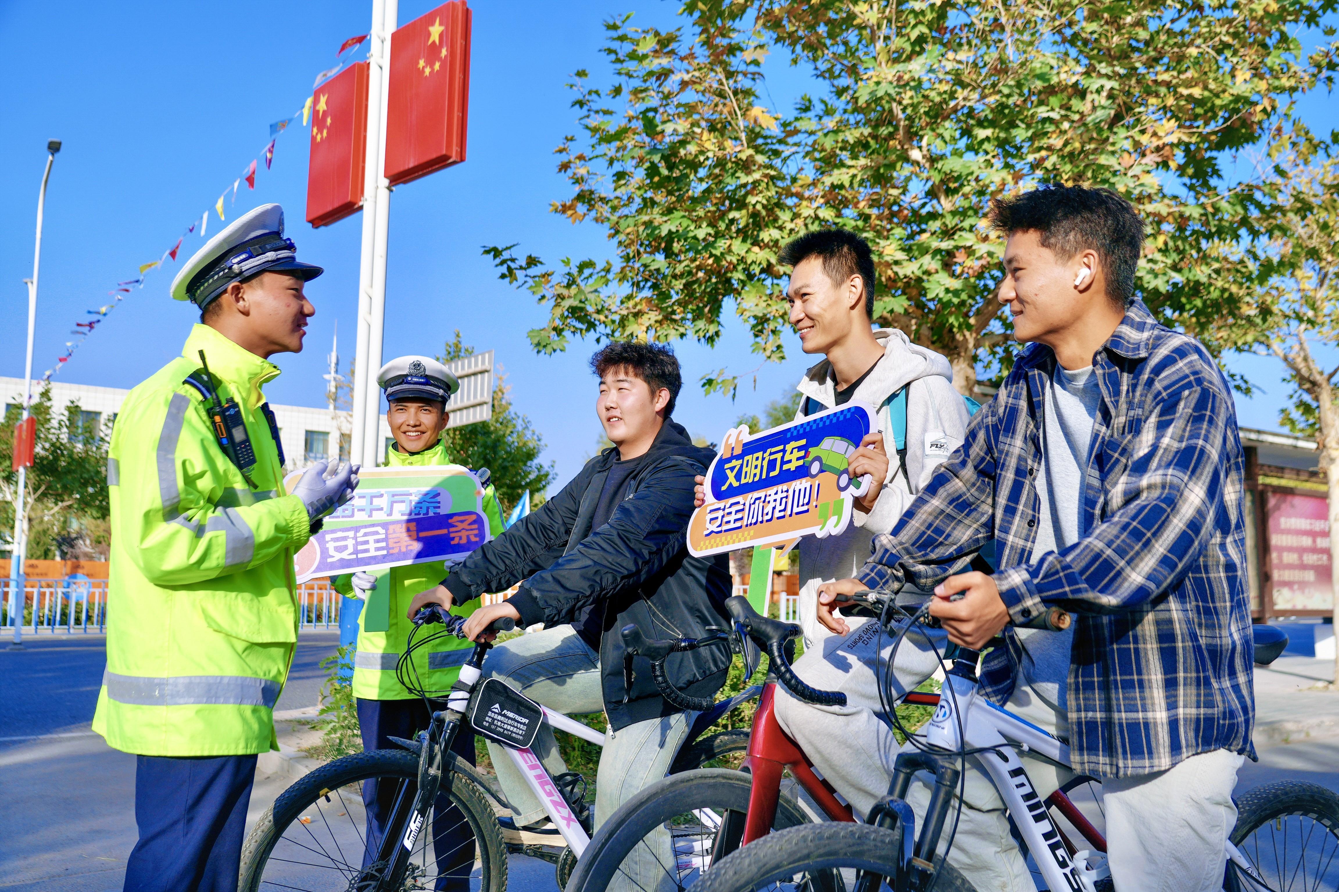 圖為10月16日,溫宿縣公安局交通管理大隊(duì)民警向新疆理工學(xué)院學(xué)生普及文明騎車相關(guān)知識(shí),引導(dǎo)學(xué)生切勿逆向行駛。