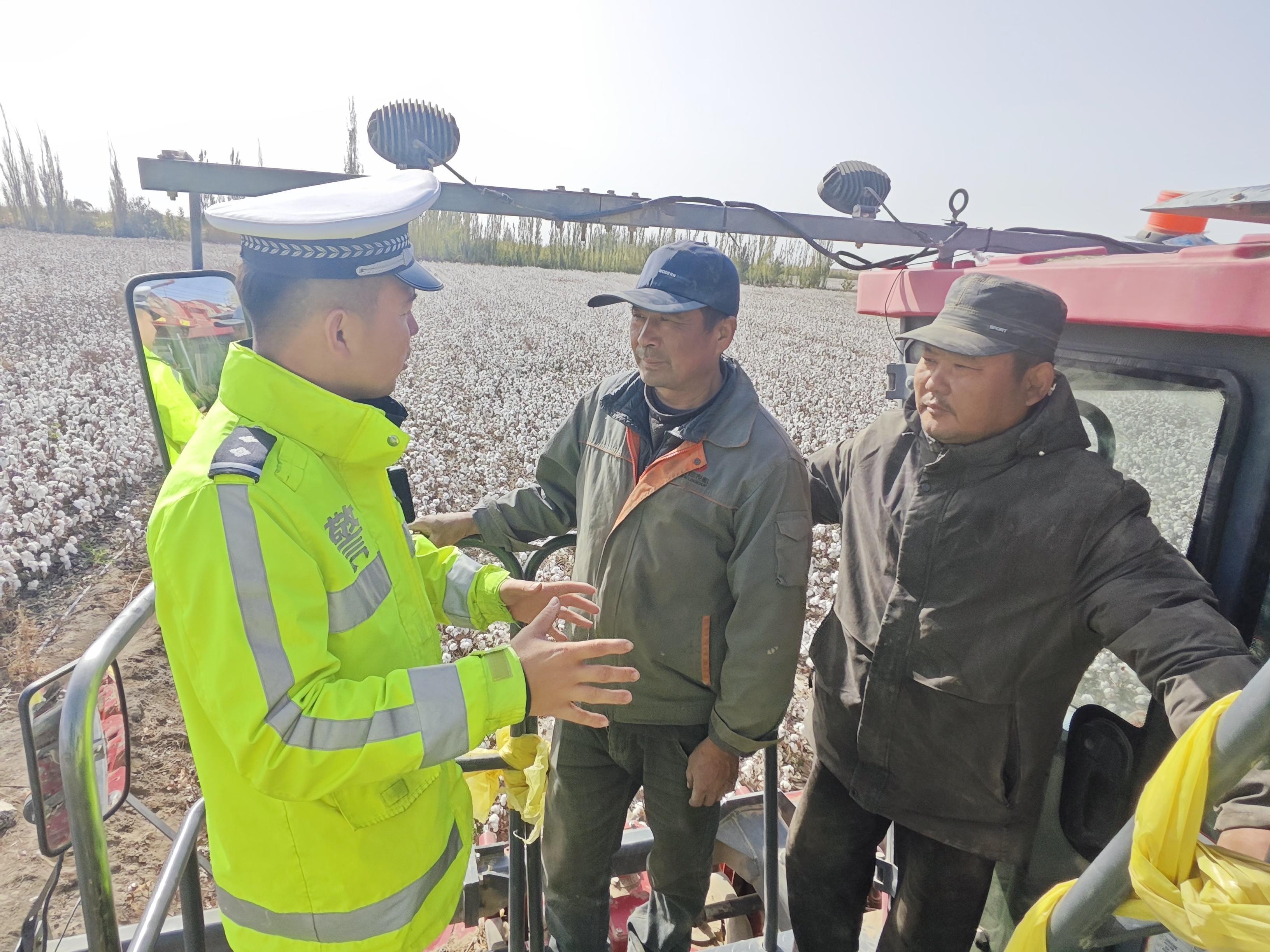 金秋時(shí)節(jié),新疆庫(kù)爾勒市120萬(wàn)畝棉花迎來(lái)采收旺季。10月21日,庫(kù)爾勒市公安局交通管理大隊(duì)庫(kù)普路中隊(duì)大力開(kāi)展“護(hù)航到棉田、上門(mén)送安全”交通安全主題宣講活動(dòng),民警面對(duì)面向群眾送法律、送安全、送服務(wù),提升大家知危險(xiǎn)會(huì)避險(xiǎn)和自我保護(hù)能力,全力維護(hù)農(nóng)村交通安全形勢(shì)平穩(wěn),確保棉花順利采收和安全運(yùn)輸。