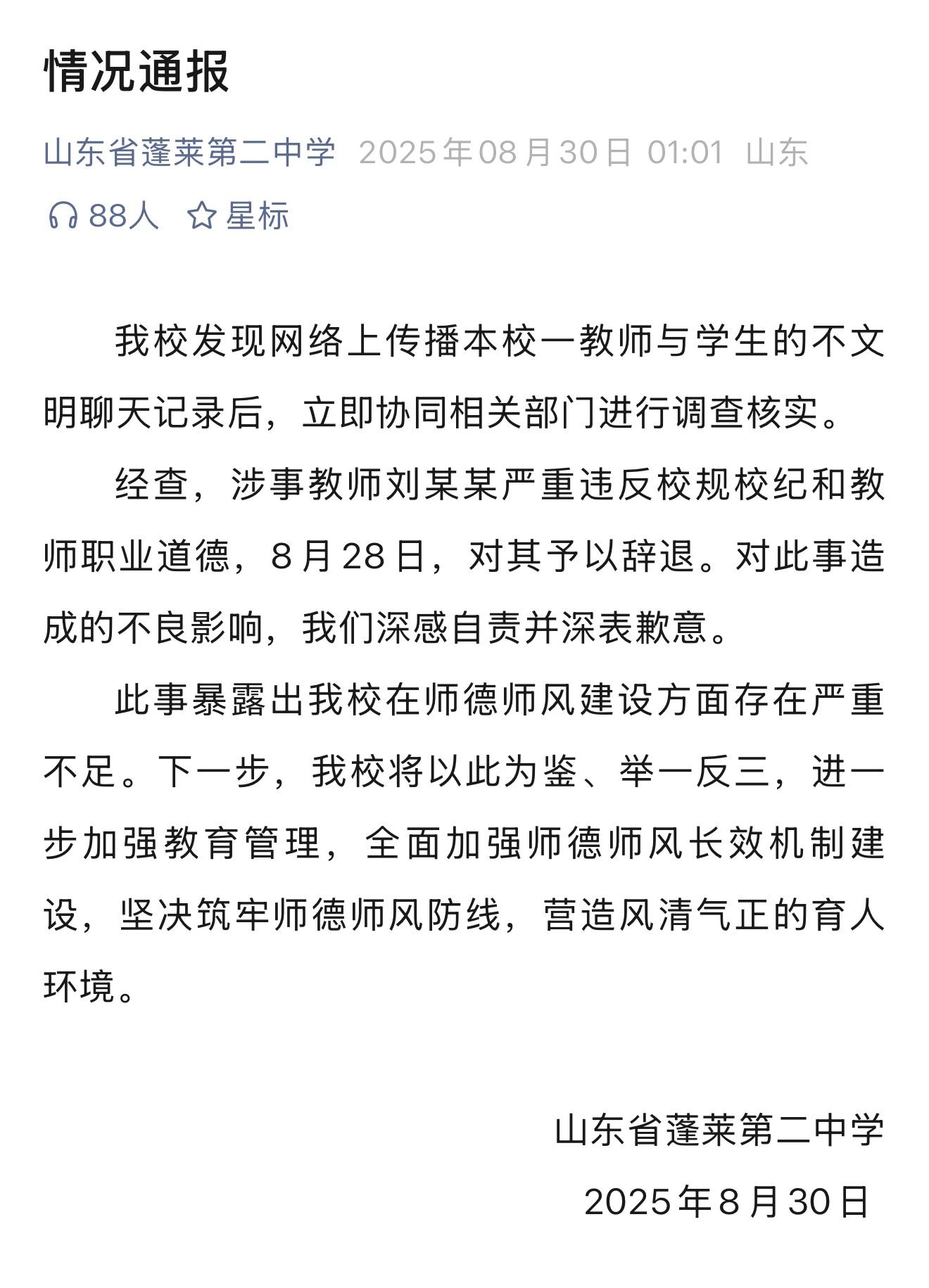 8月30日1點1分,山東省煙臺市蓬萊第二中學通過官方微信公眾號發(fā)布情況通報,對網(wǎng)傳“教師與學生不文明聊天記錄”事件進行回應,通報原文如下: