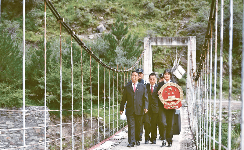 青海省果洛藏族自治州班瑪縣地處高原,山大溝深,群眾居住分散。近年來,班瑪縣人民法院深入各鄉(xiāng)鎮(zhèn),將巡回法庭搬到森林、草原,在牧民家門口提供訴訟服務,還通過以案說法、模擬法庭等形式,開展法律咨詢、法治宣傳。圖為2021年8月7日,班瑪縣人民法院巡回法庭成員前往燈塔鄉(xiāng)班前村提供法律服務?!⌒氯A社記者 張龍/攝