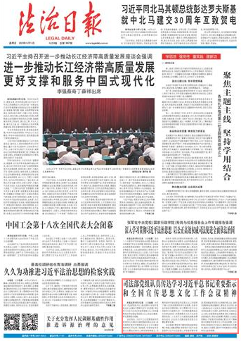 會議強調(diào),要堅持不懈用黨的創(chuàng)新理論凝心鑄魂,在融會貫通、學(xué)悟篤行習(xí)近平法治思想和習(xí)近平文化思想上采取更多硬實舉措。要加強宣傳思想文化領(lǐng)域行政立法,加快完善相關(guān)法律法規(guī)體系。要堅定文化自信,深入推進(jìn)社會主義法治文化建設(shè),加強中華優(yōu)秀傳統(tǒng)法律文化保護(hù)、宣傳和傳承,弘揚社會主義核心價值觀和法治精神。要扎實做好法治新聞宣傳,講好法治故事,鞏固壯大主流思想輿論,守好意識形態(tài)陣地。要以釘釘子精神落實全國宣傳思想文化工作會議部署,立足職能為在新的歷史起點上繼續(xù)推動文化繁榮、建設(shè)文化強國、建設(shè)中華民族現(xiàn)代文明提供有力法治保障。