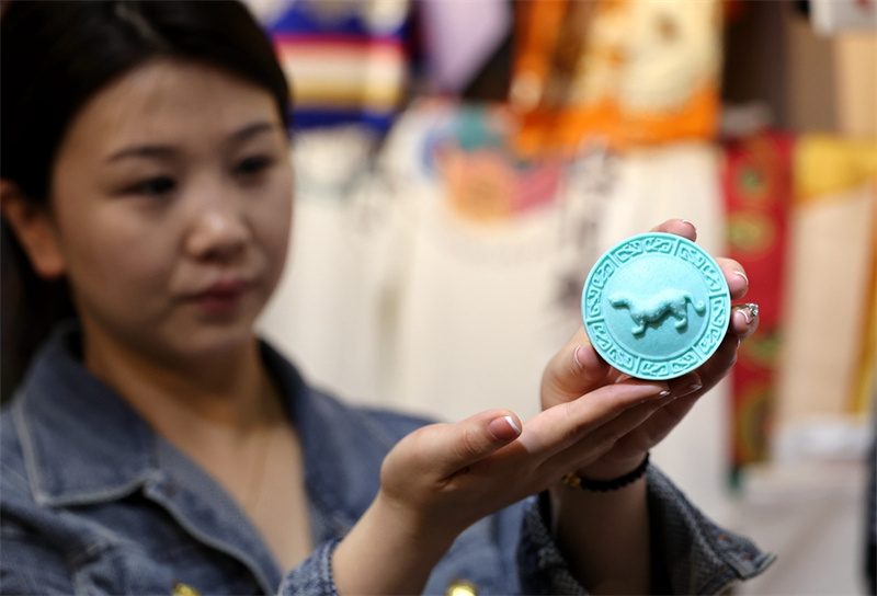 2024年4月23日,秦漢新城新絲路數字文化科技有限公司的工作人員展示一款由杜虎符開發(fā)而成的文創(chuàng)手工皂。新華社記者 李一博 攝