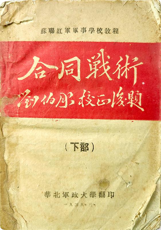 《合同戰(zhàn)術(shù)》,蘇聯(lián)紅軍軍事學(xué)校教程,系統(tǒng)論述多兵種戰(zhàn)斗特性和協(xié)同作戰(zhàn),是劉伯承等人著眼于人民軍隊(duì)未來(lái)戰(zhàn)術(shù)的發(fā)展,在戰(zhàn)斗間隙精心翻譯出來(lái)的。