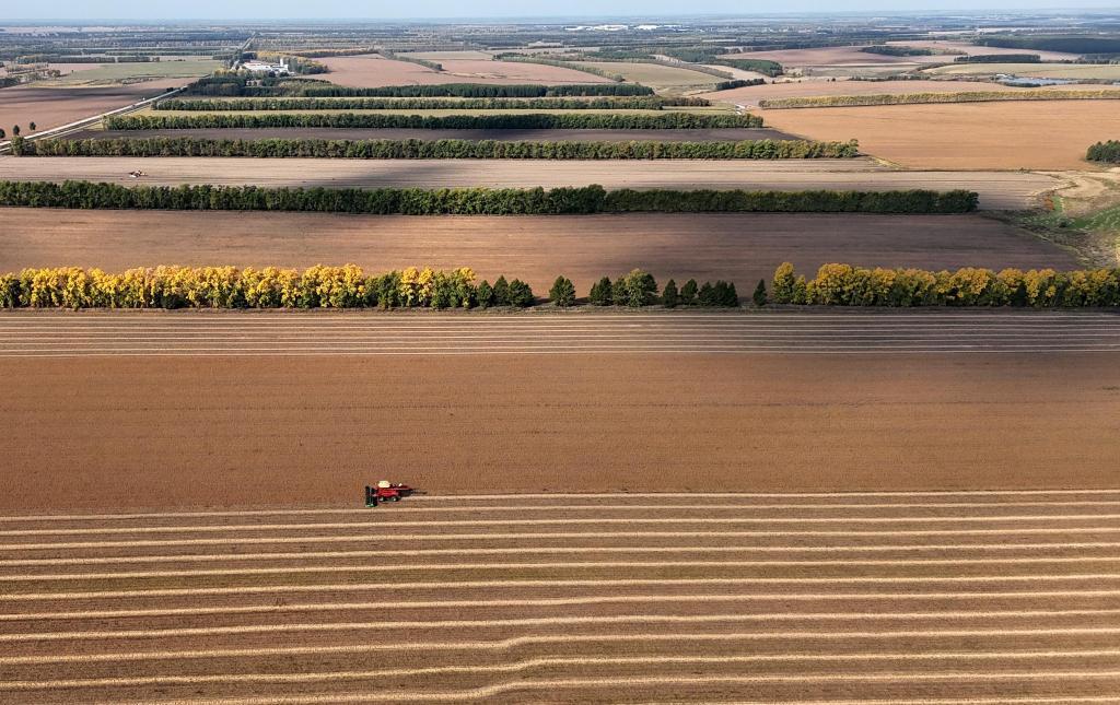 9月23日,在北大荒集團黑龍江格球山農場有限公司大豆地塊,農機在進行收獲作業(yè)(無人機照片)。新華社發(fā)(陸文祥攝)