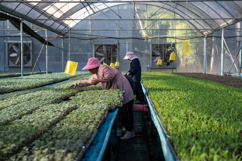 工作人員在云南省元謀縣的育苗工廠大棚內進行育苗工作。受訪者供圖。
