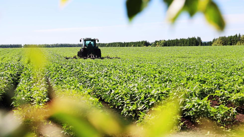 在北大荒集團黑龍江紅星農場第一管理區(qū)有機大豆田里,搭載北斗導航系統(tǒng)的大馬力機車開展有機大豆二次中耕作業(yè)(2025年7月7日攝)。新華社發(fā)(侯越攝)